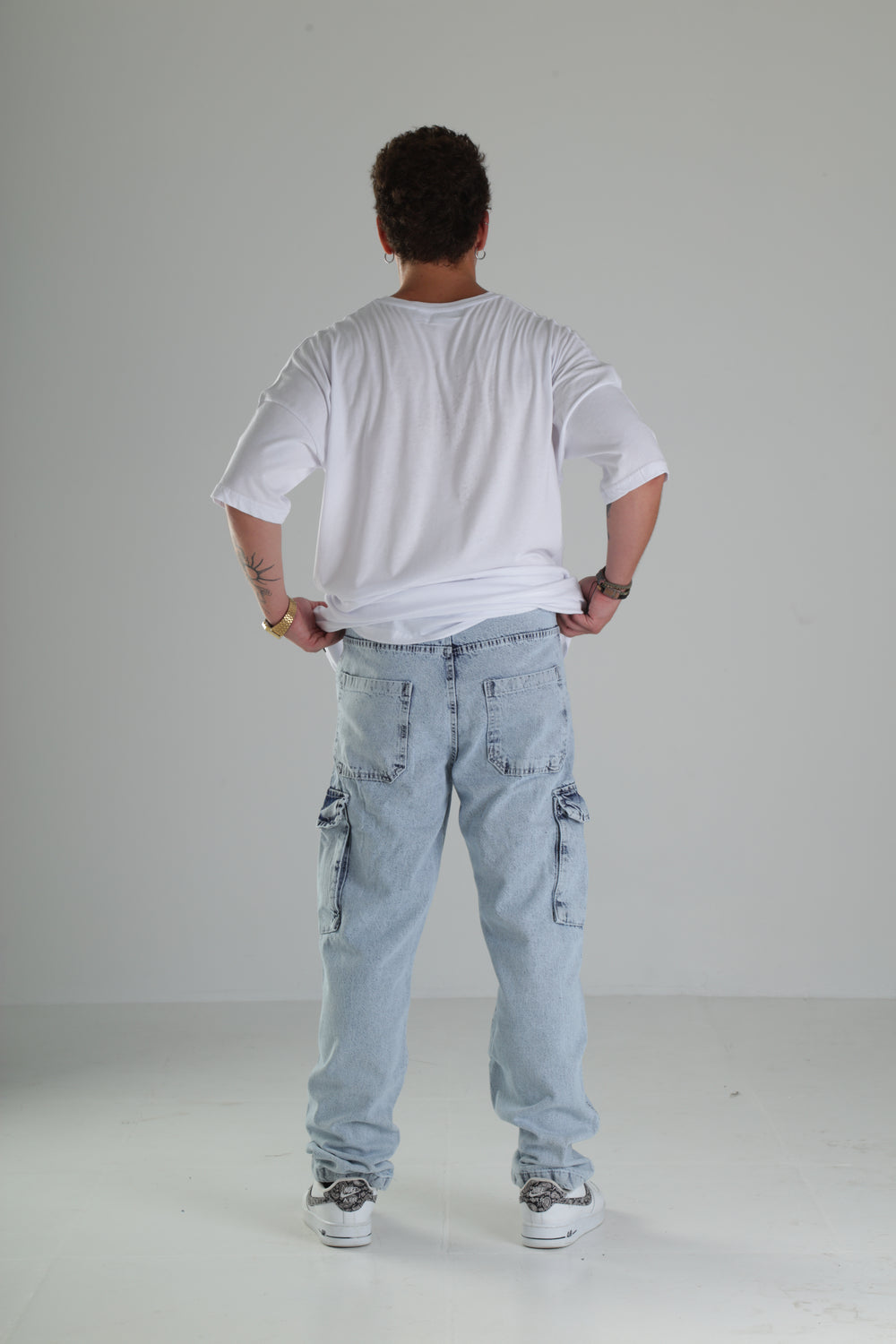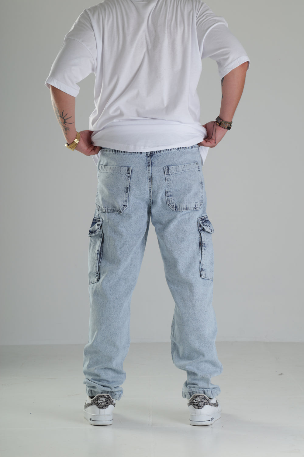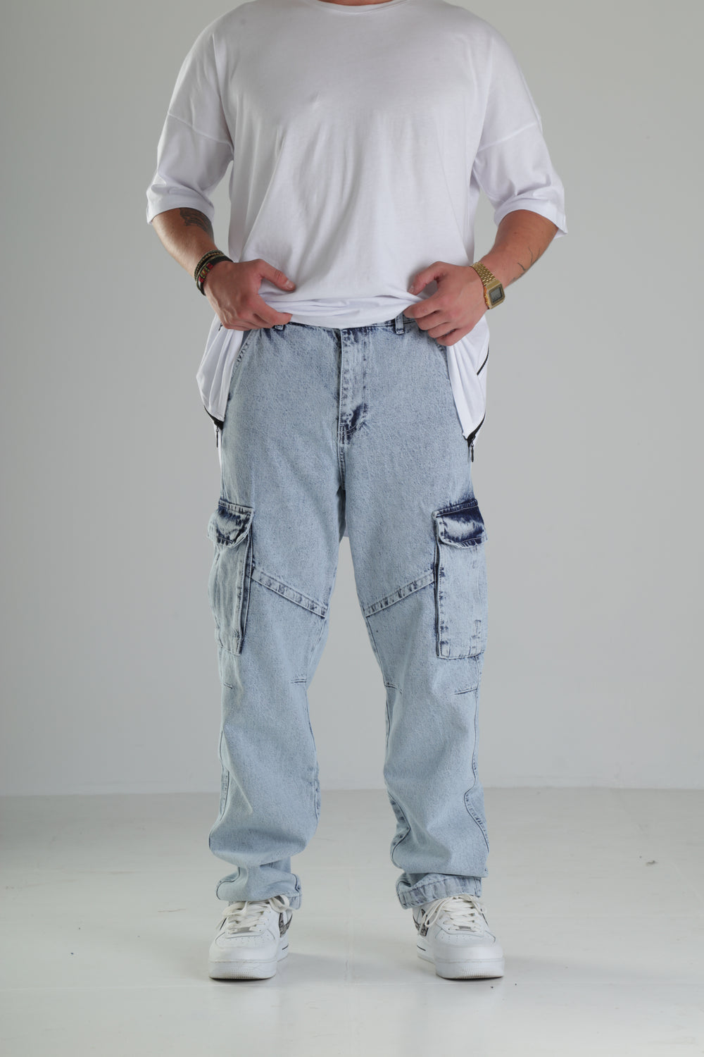 Açık Mavi Yıkamalı Kargo Pantolon özgün tasarımı ile modern ve şık bir görünüm sunar.