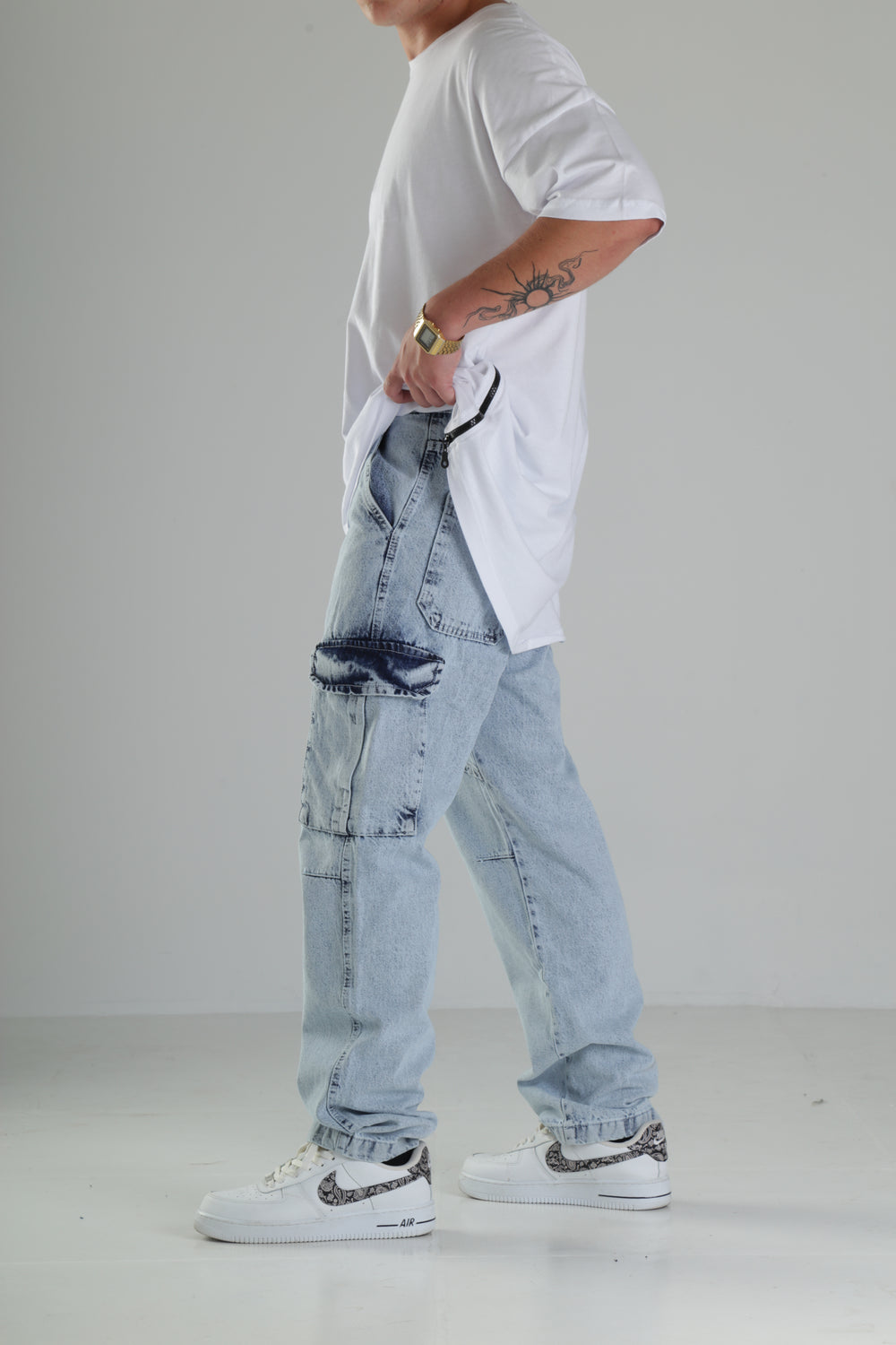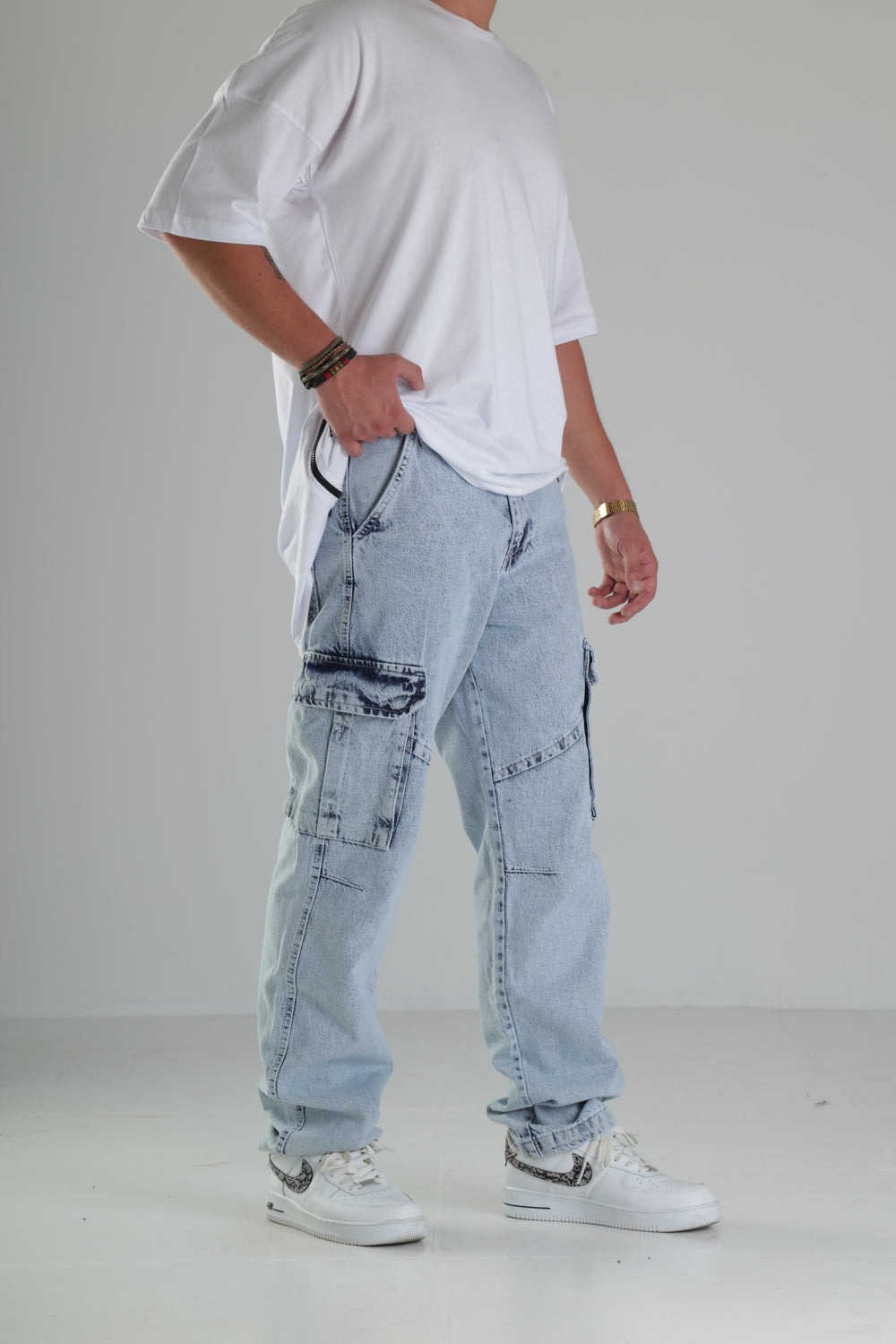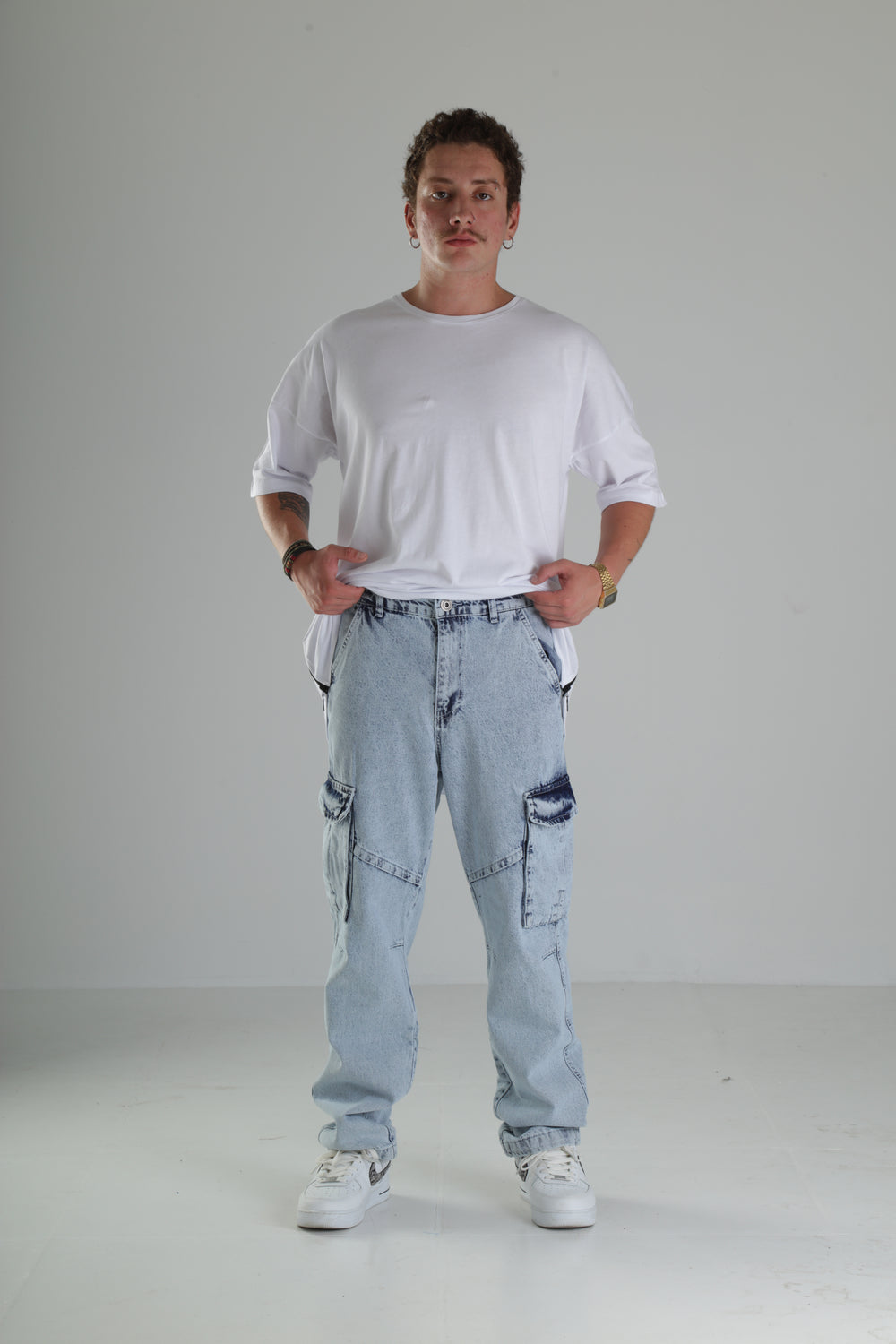 Açık Mavi Yıkamalı Kargo Pantolon özgün tasarımı ile modern ve şık bir görünüm sunar.