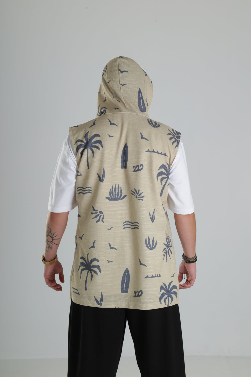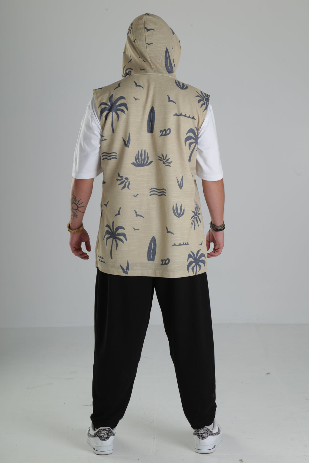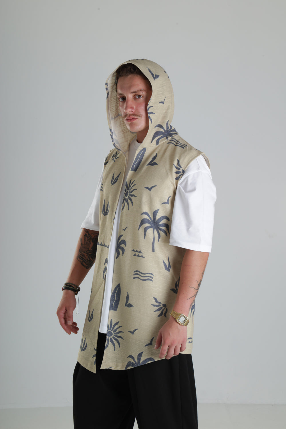 Bej Palmiye Desenli Kapüşonlu Yelek özgün tasarımı ile modern ve şık bir görünüm sunar.