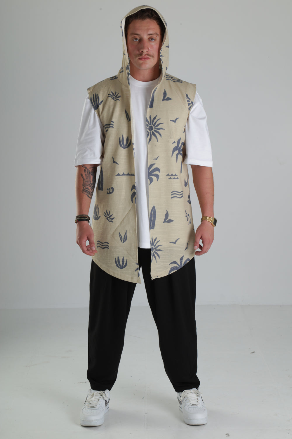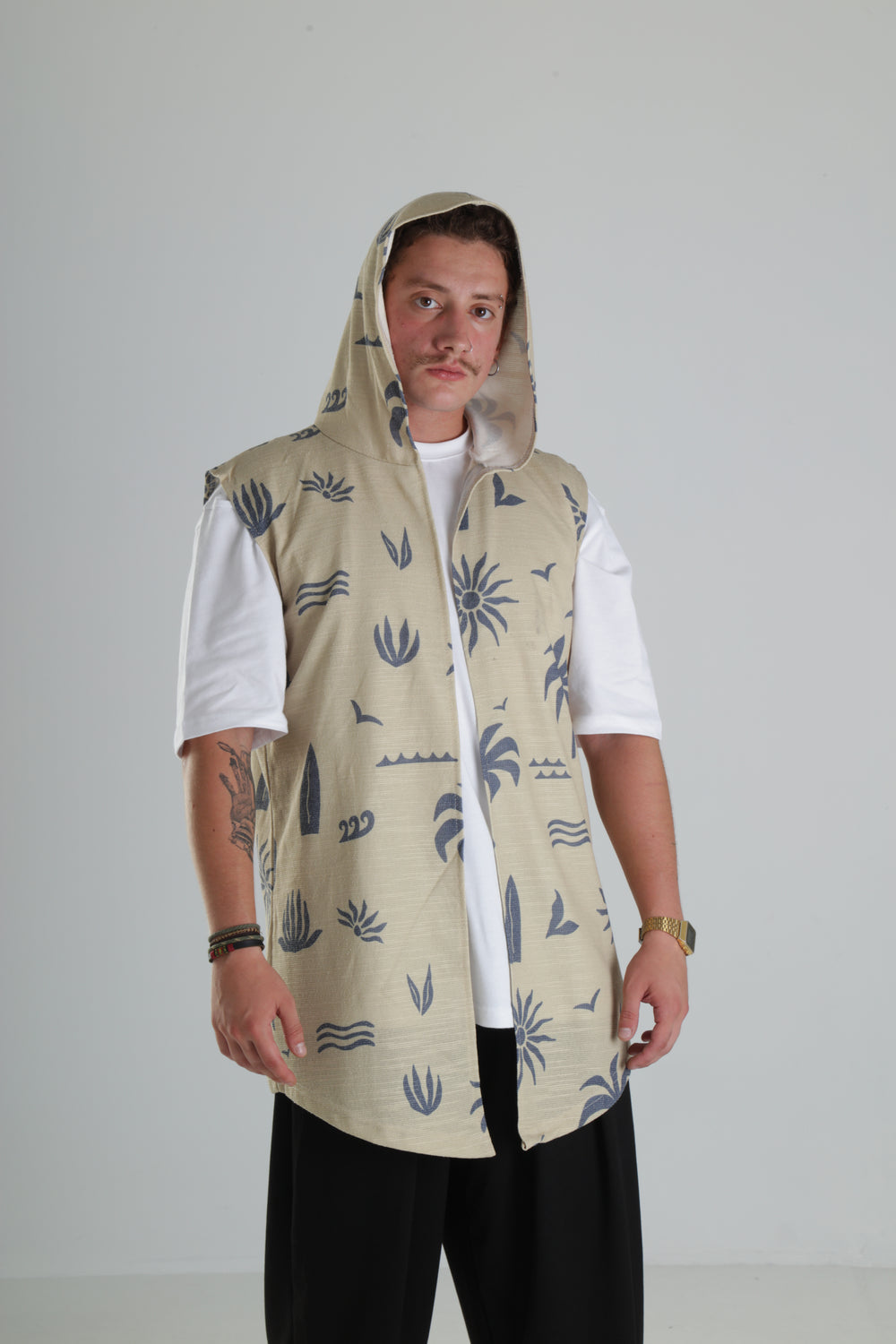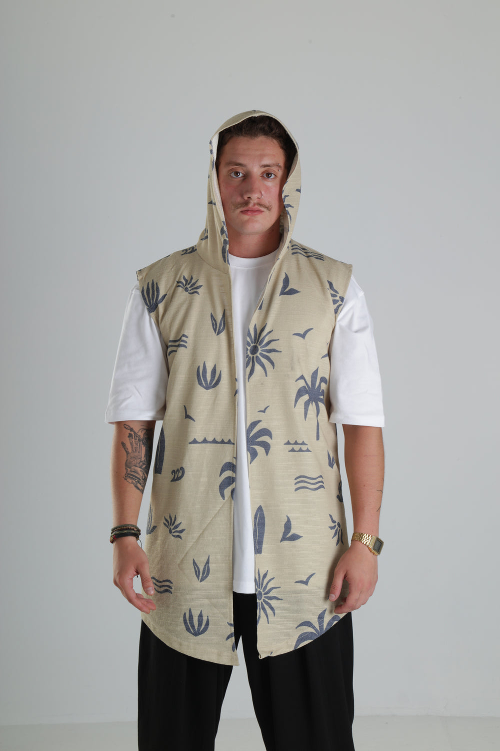 Bej Palmiye Desenli Kapüşonlu Yelek özgün tasarımı ile modern ve şık bir görünüm sunar.