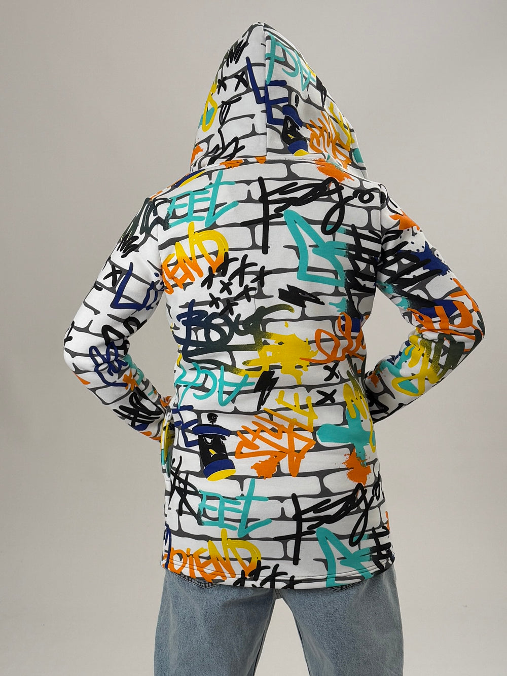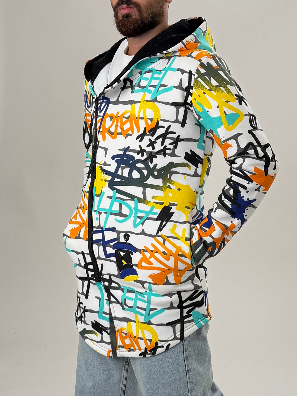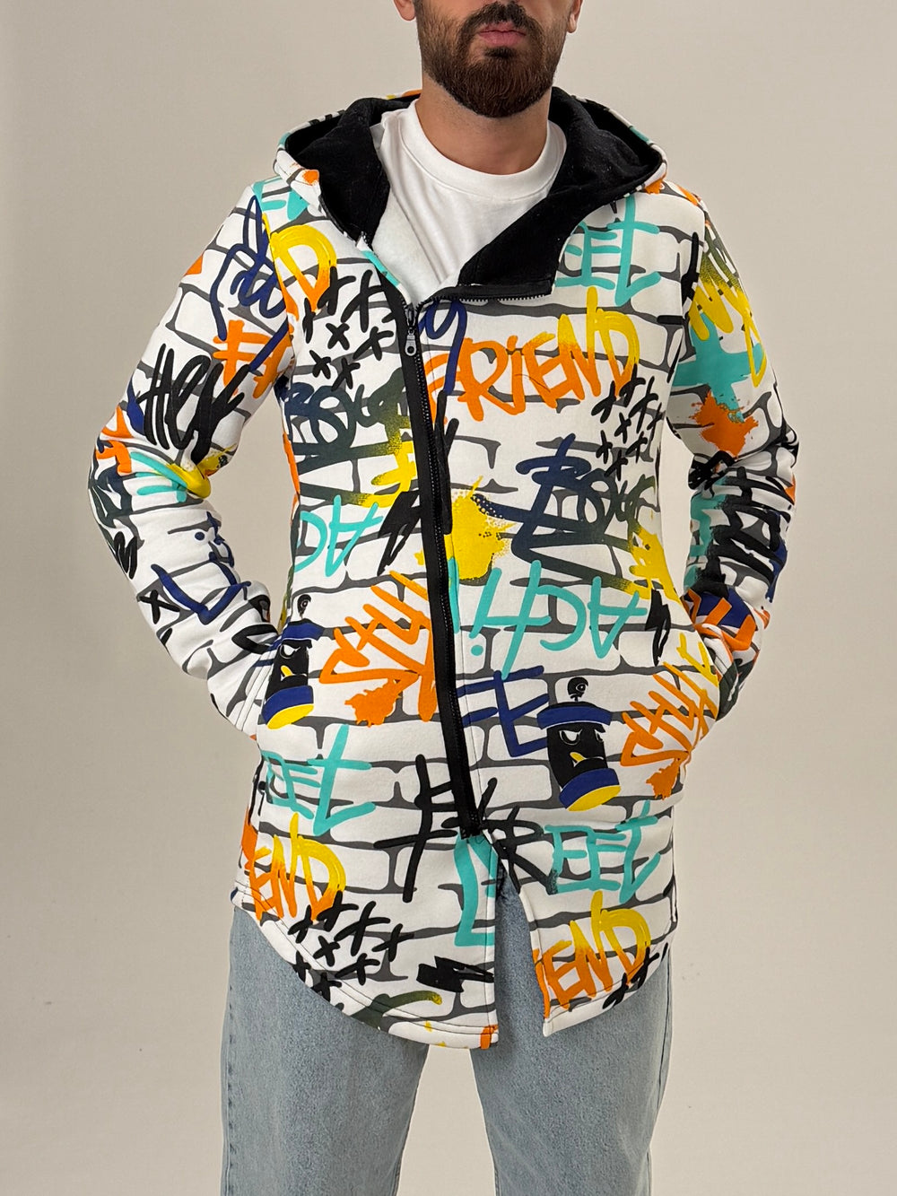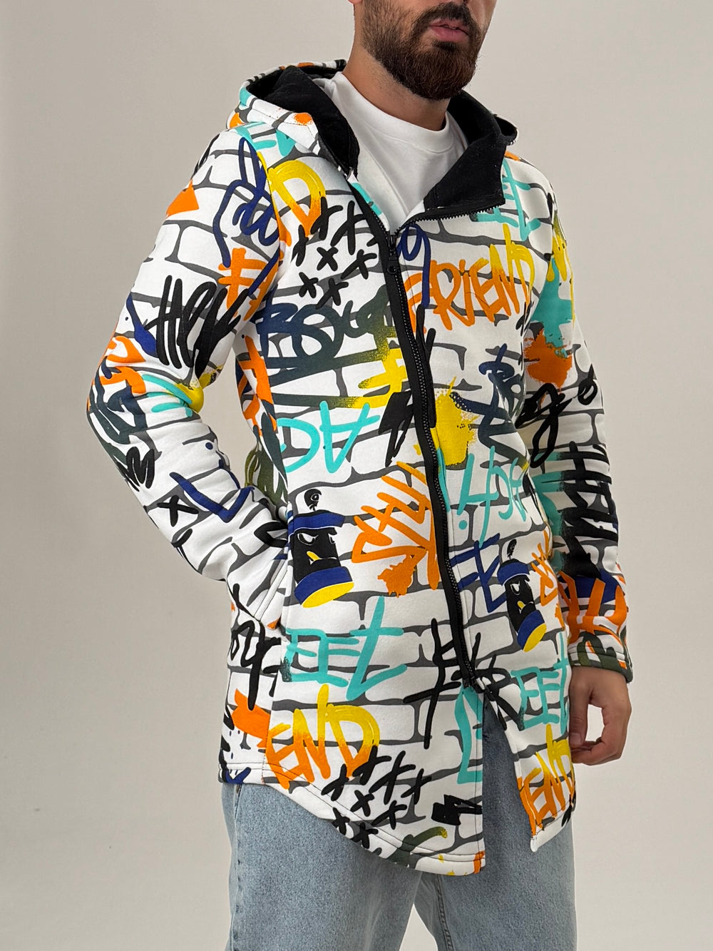 Graffiti Kapüşonlu Uzun Hırka özgün tasarımı ile modern ve şık bir görünüm sunar.