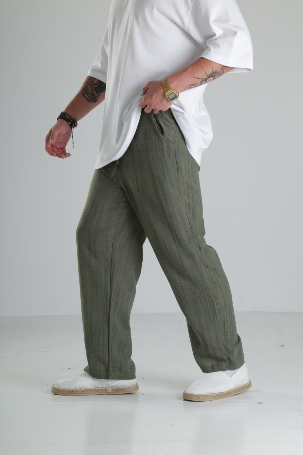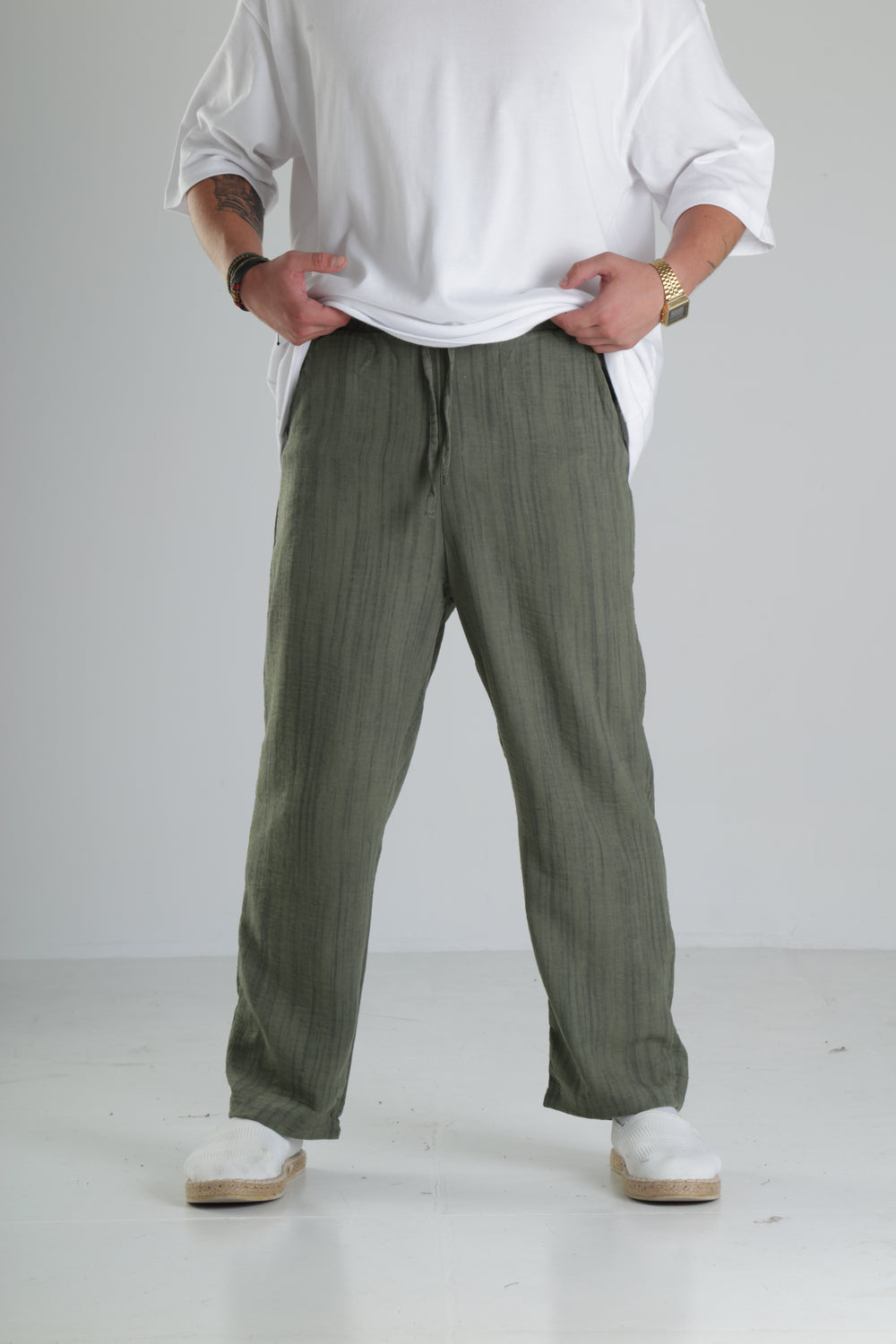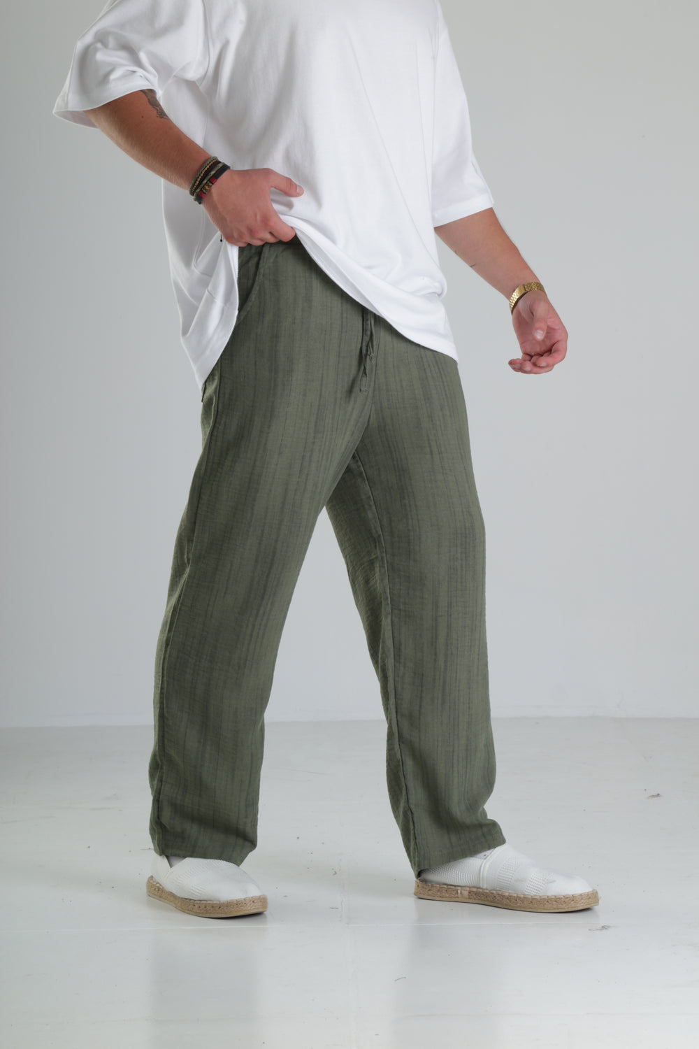 Haki Çizgili Keten Müslin Pantolon özgün tasarımı ile modern ve şık bir görünüm sunar.