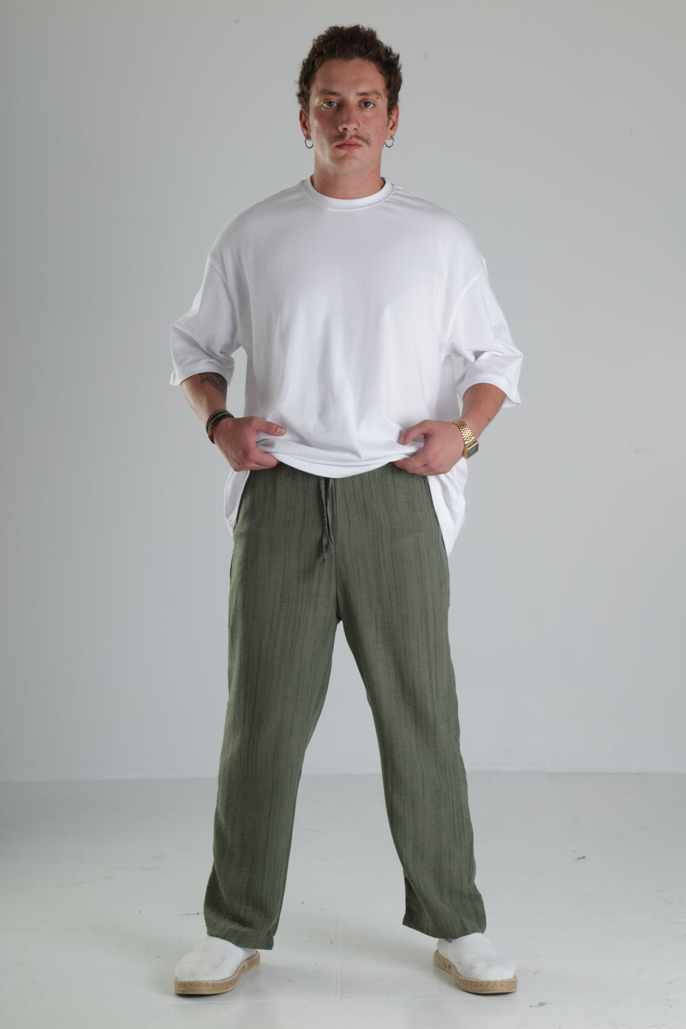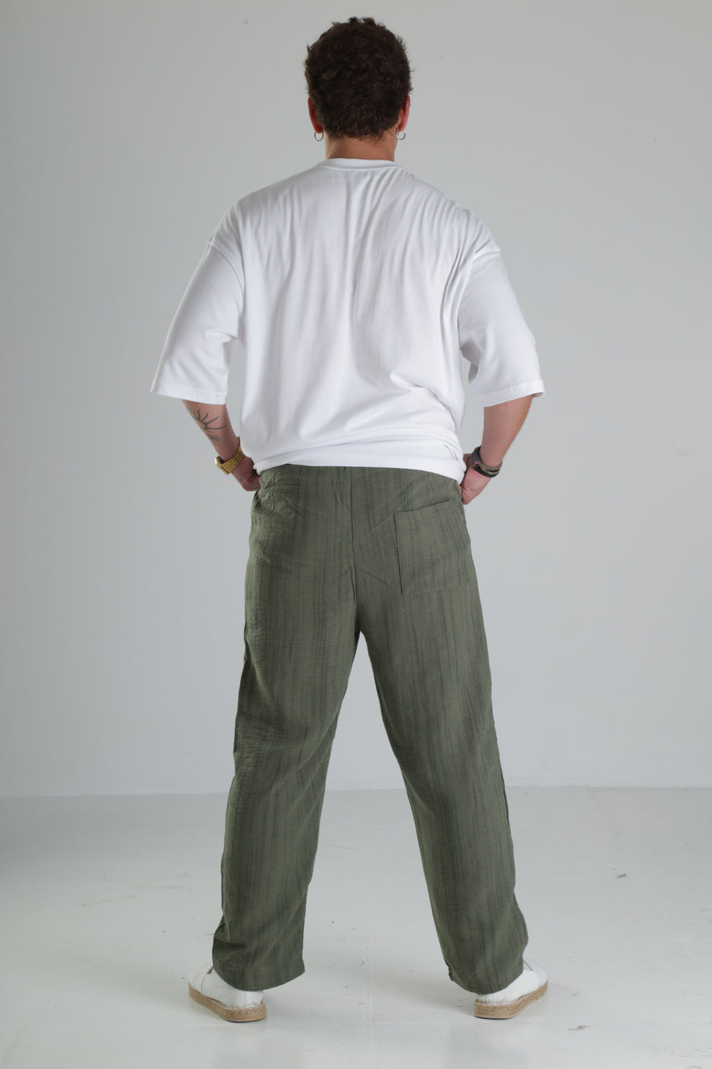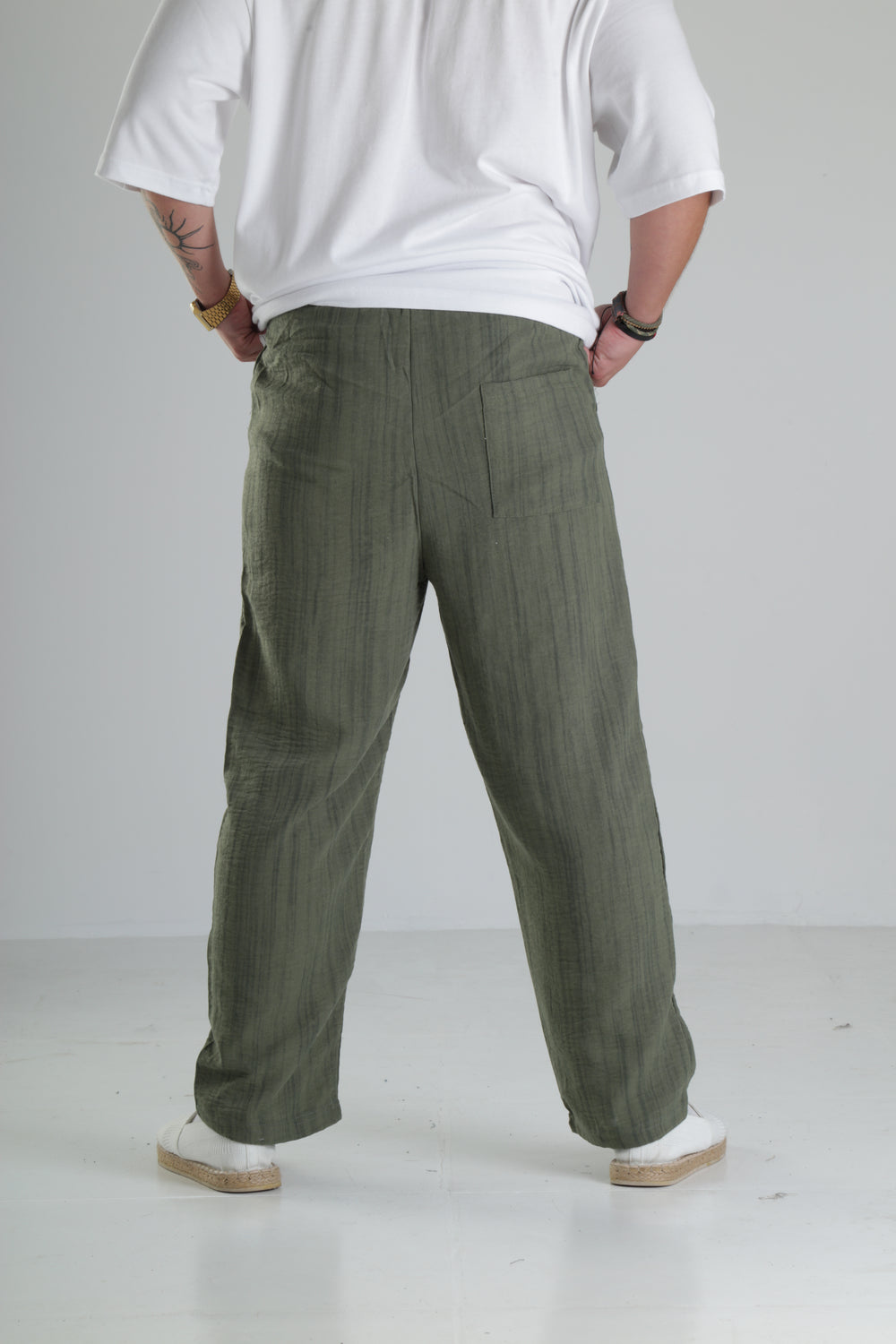 Haki Çizgili Keten Müslin Pantolon özgün tasarımı ile modern ve şık bir görünüm sunar.