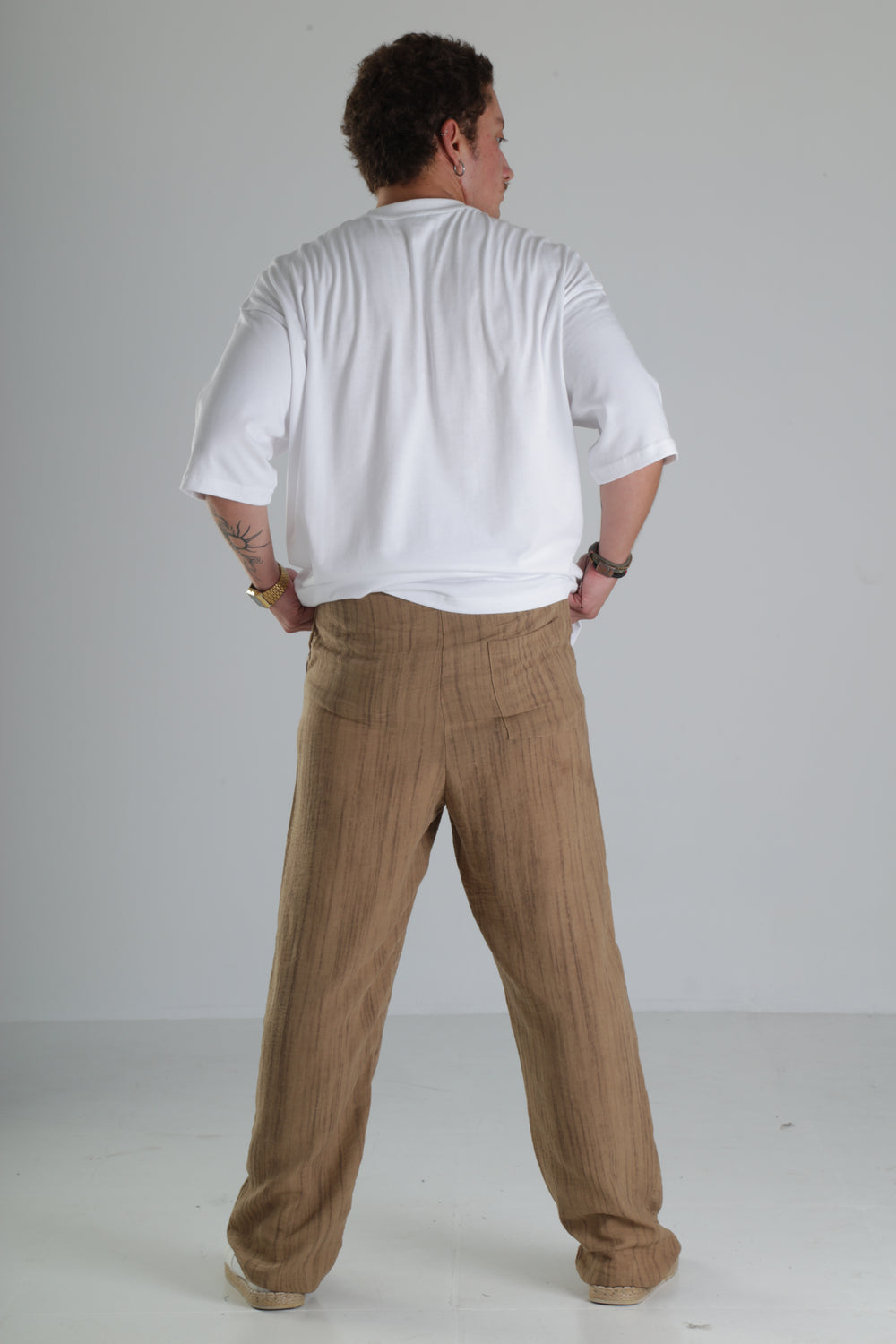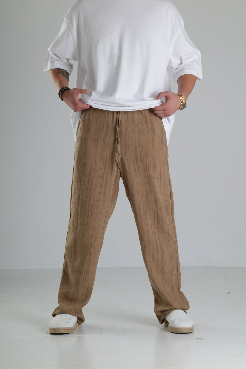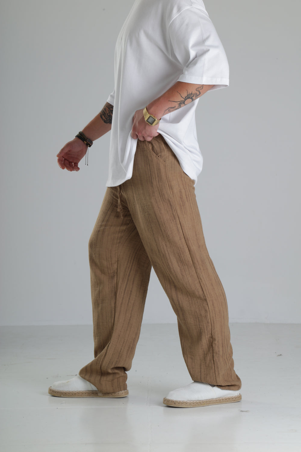 Kahverengi Keten Müslin Pantolon özgün tasarımı ile modern ve şık bir görünüm sunar.