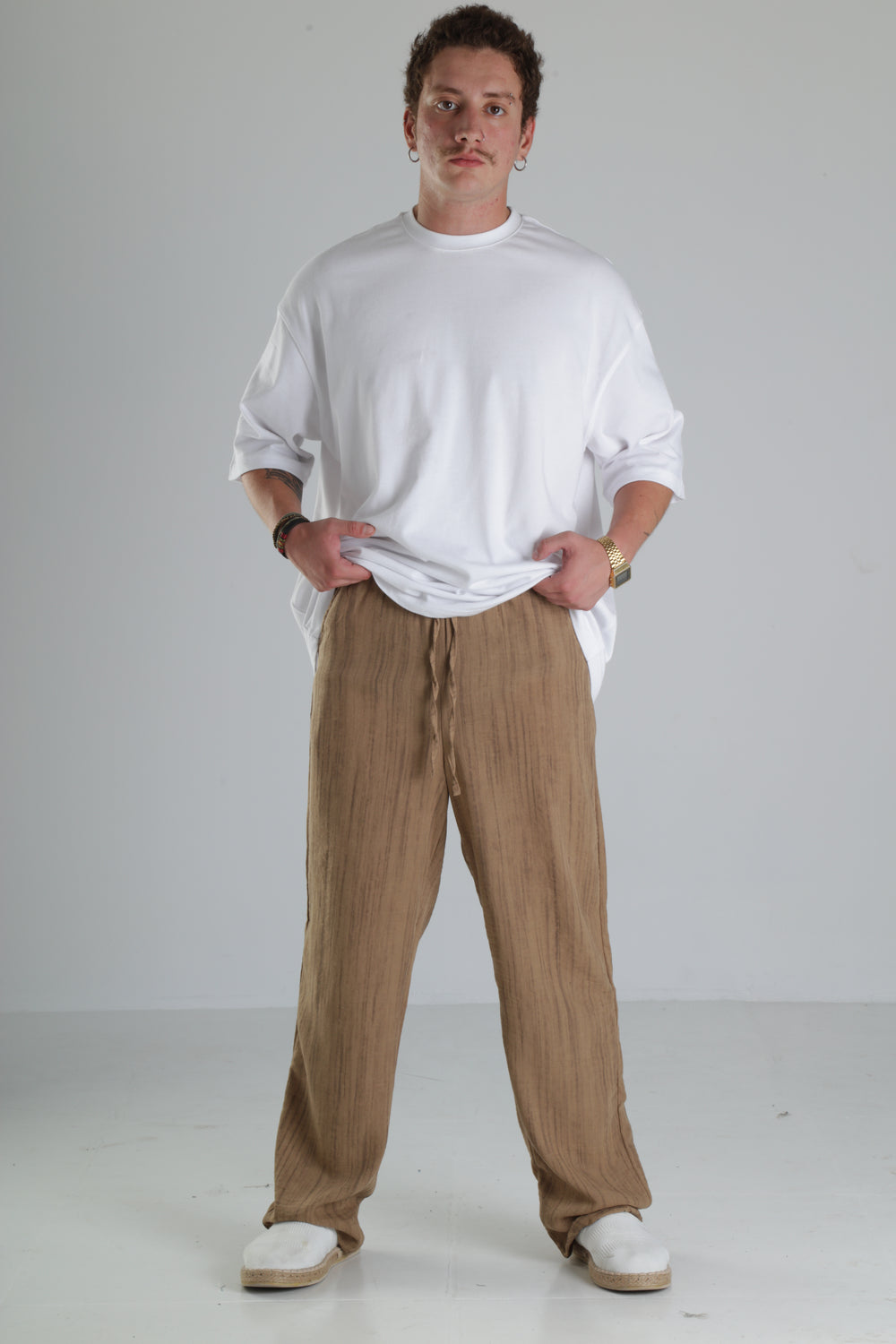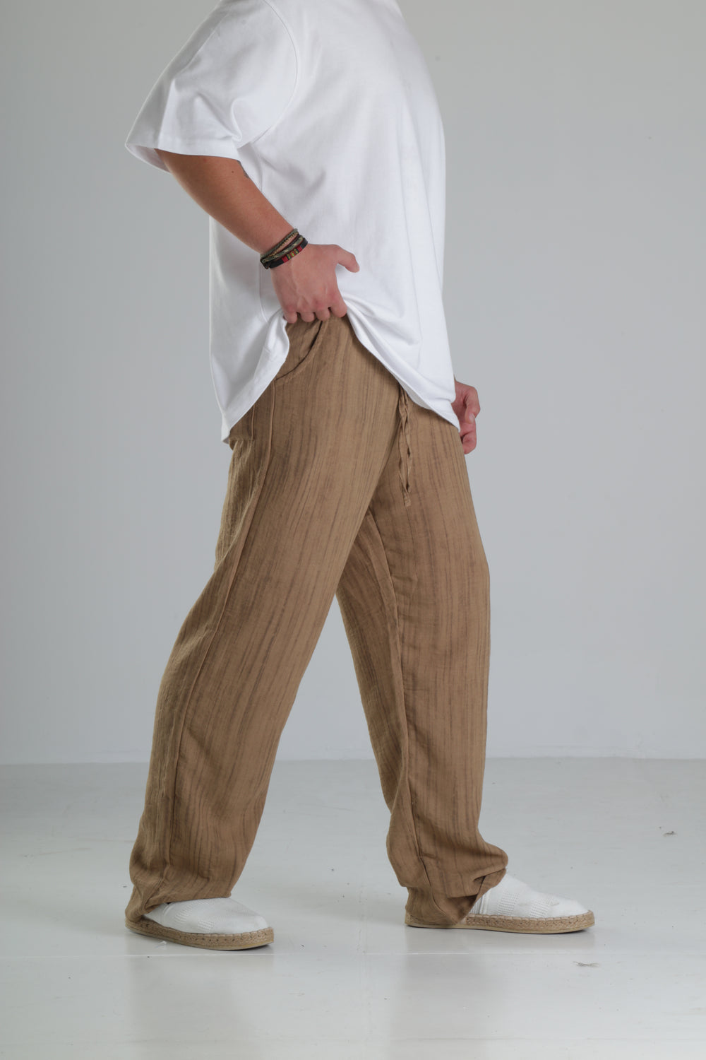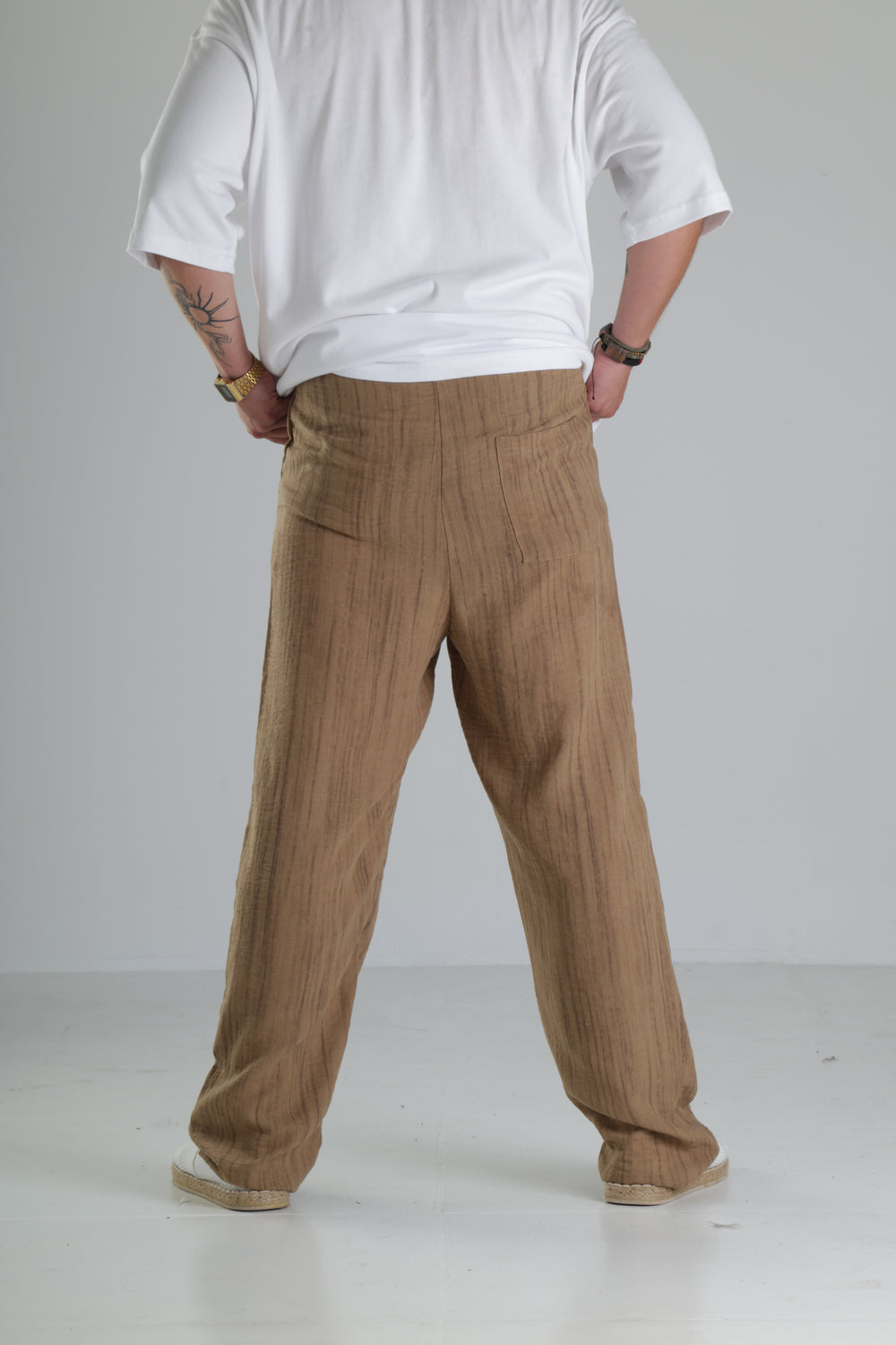 Kahverengi Keten Müslin Pantolon özgün tasarımı ile modern ve şık bir görünüm sunar.