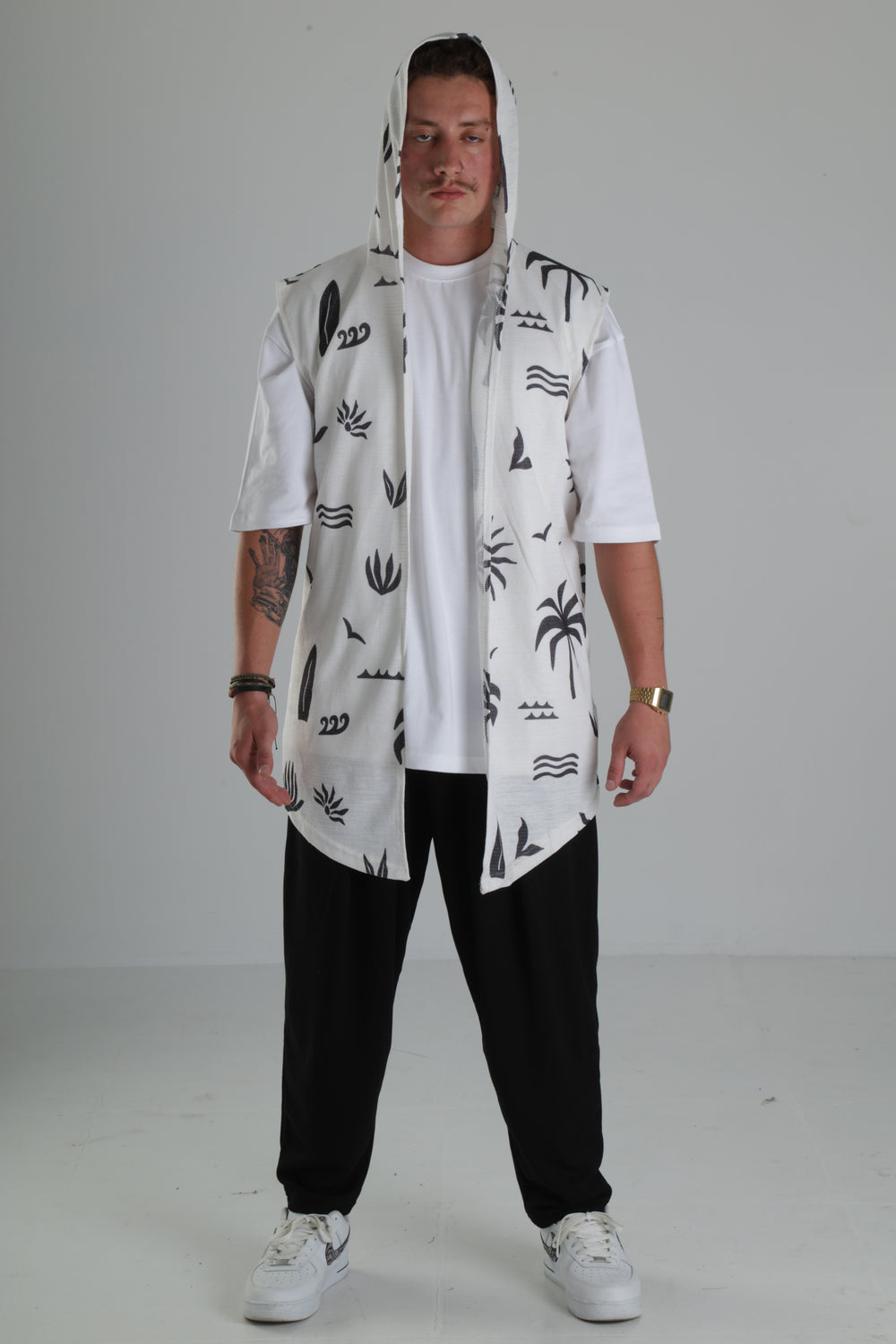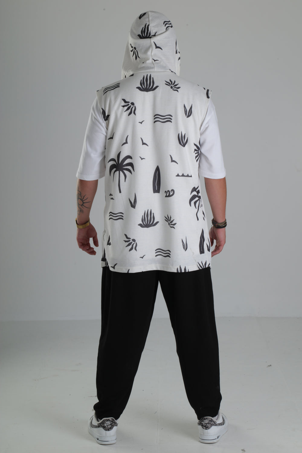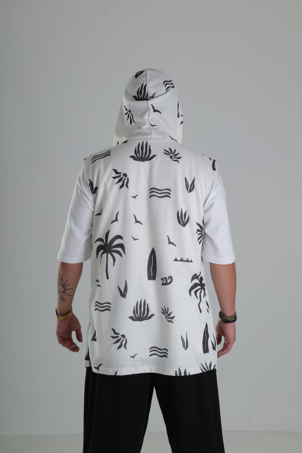 Palmiye Desenli Kapüşonlu Yelek – Beyaz özgün tasarımı ile modern ve şık bir görünüm sunar.