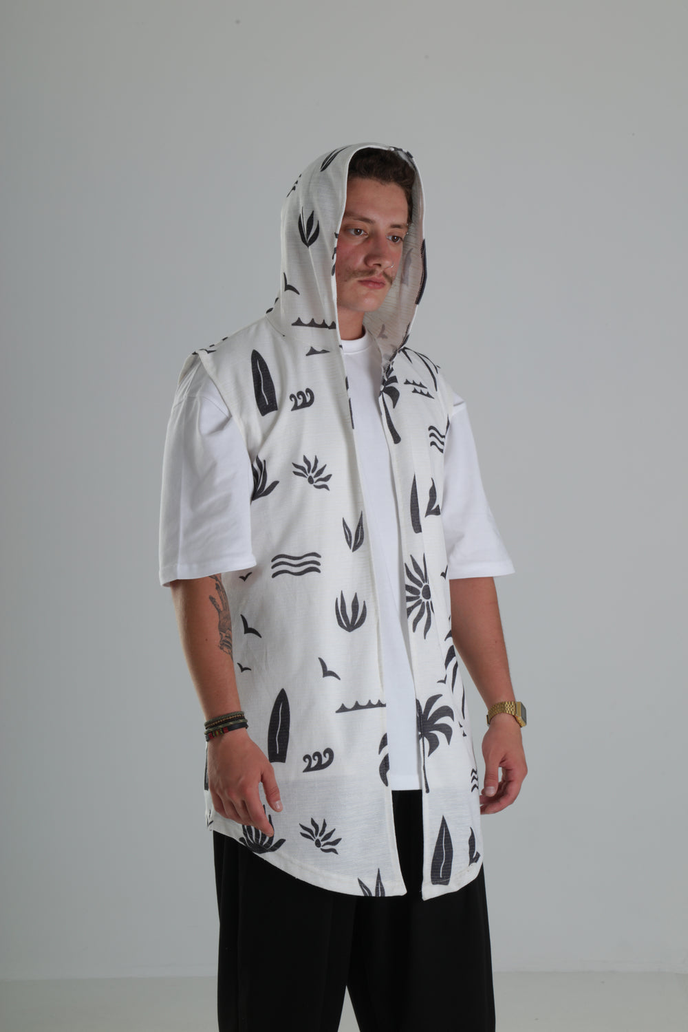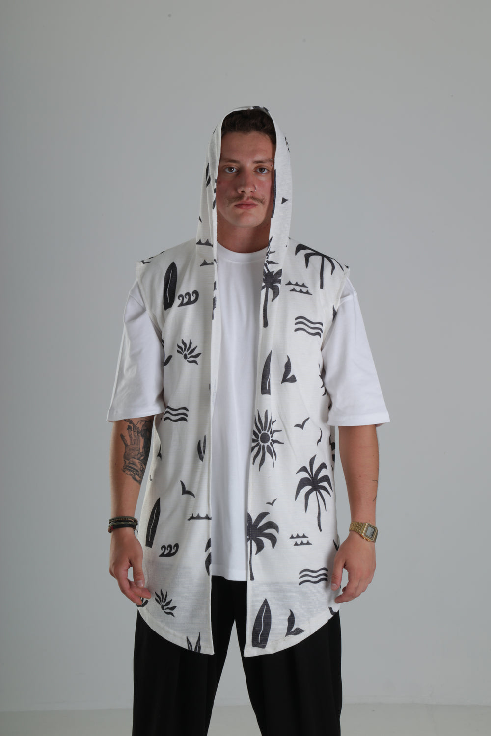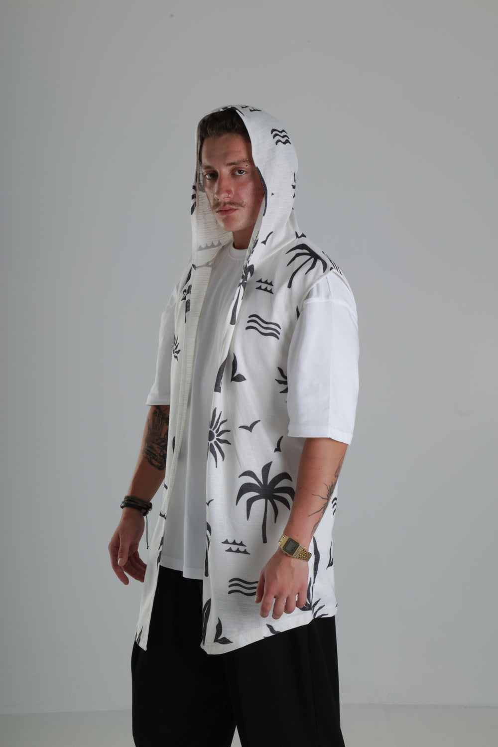 Palmiye Desenli Kapüşonlu Yelek – Beyaz özgün tasarımı ile modern ve şık bir görünüm sunar.