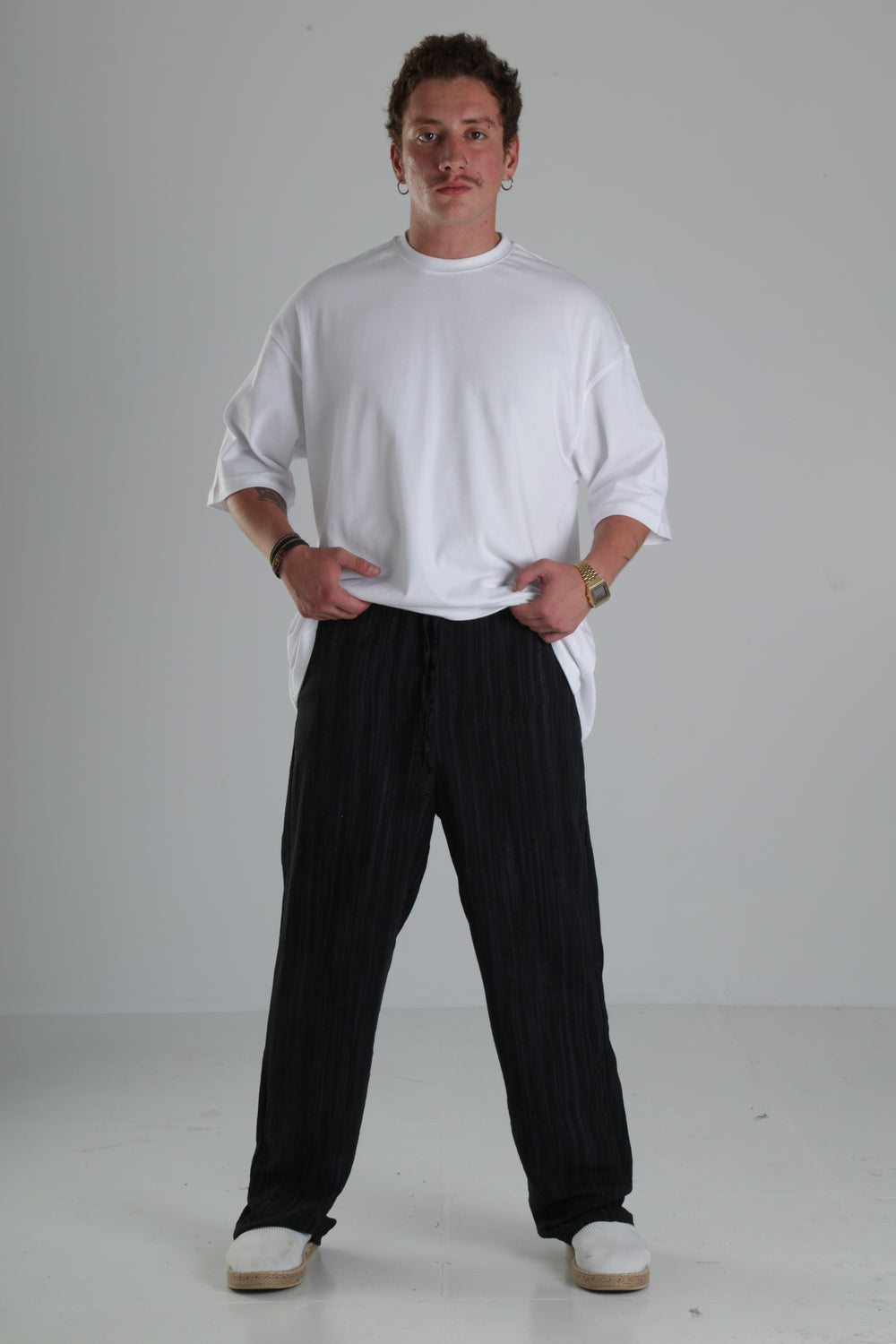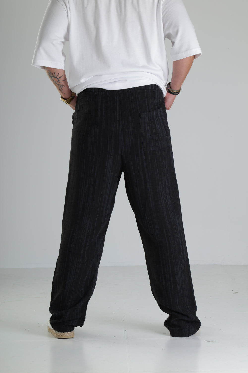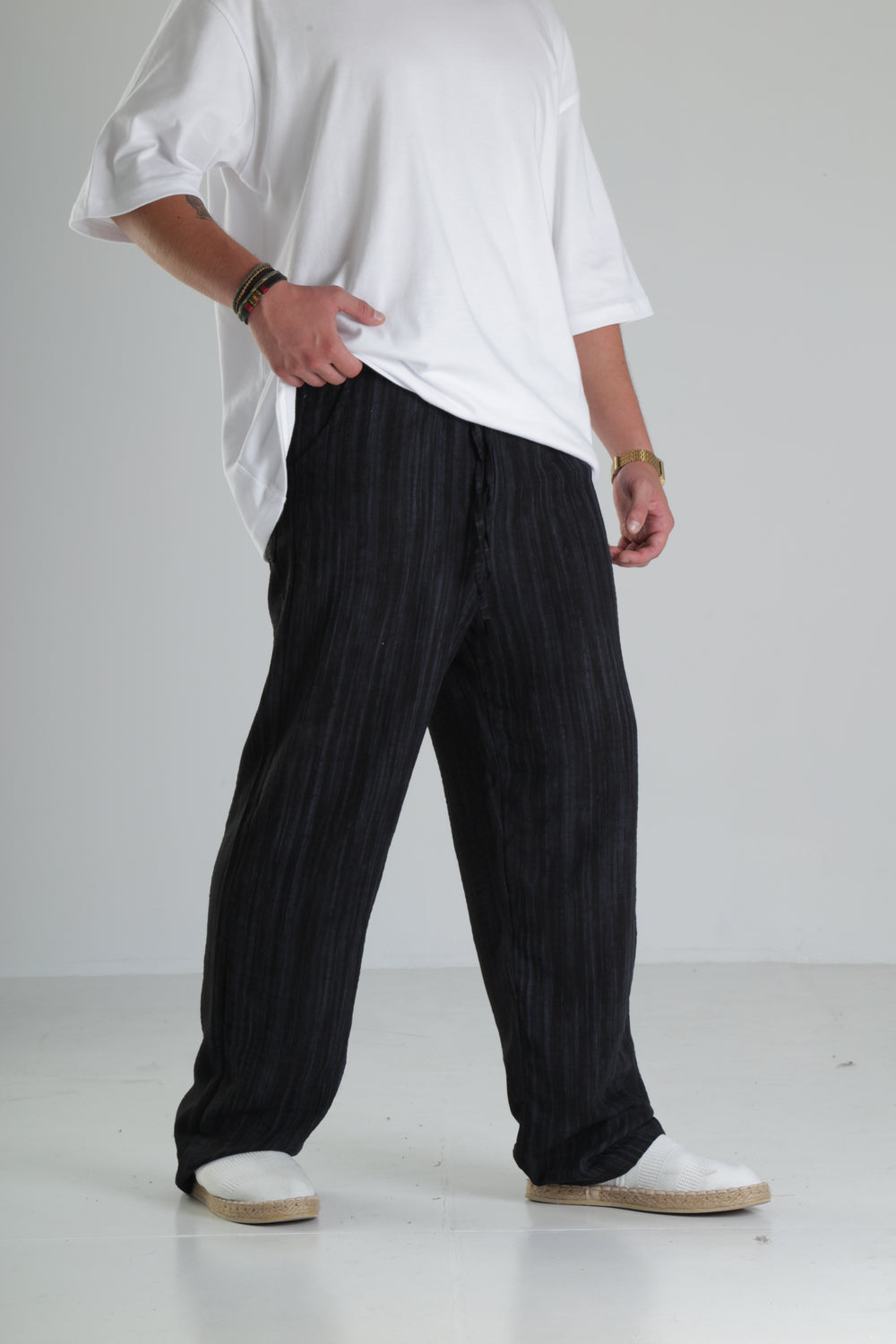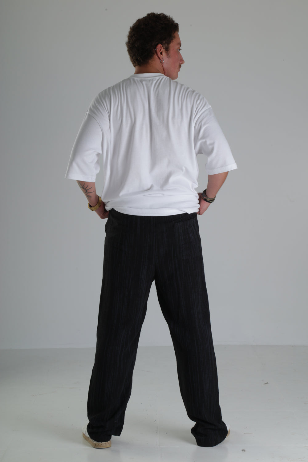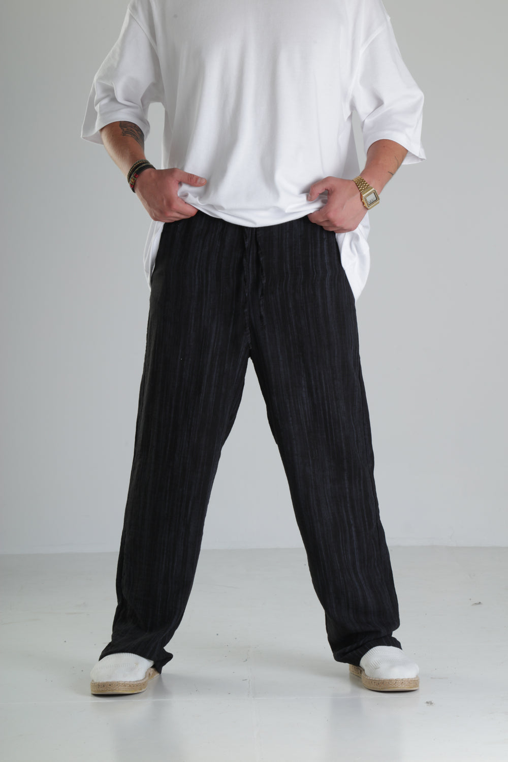 Siyah Çizgili Keten Müslin Pantolon özgün tasarımı ile modern ve şık bir görünüm sunar.